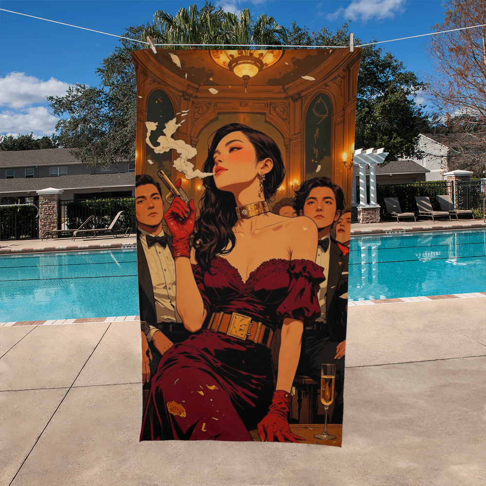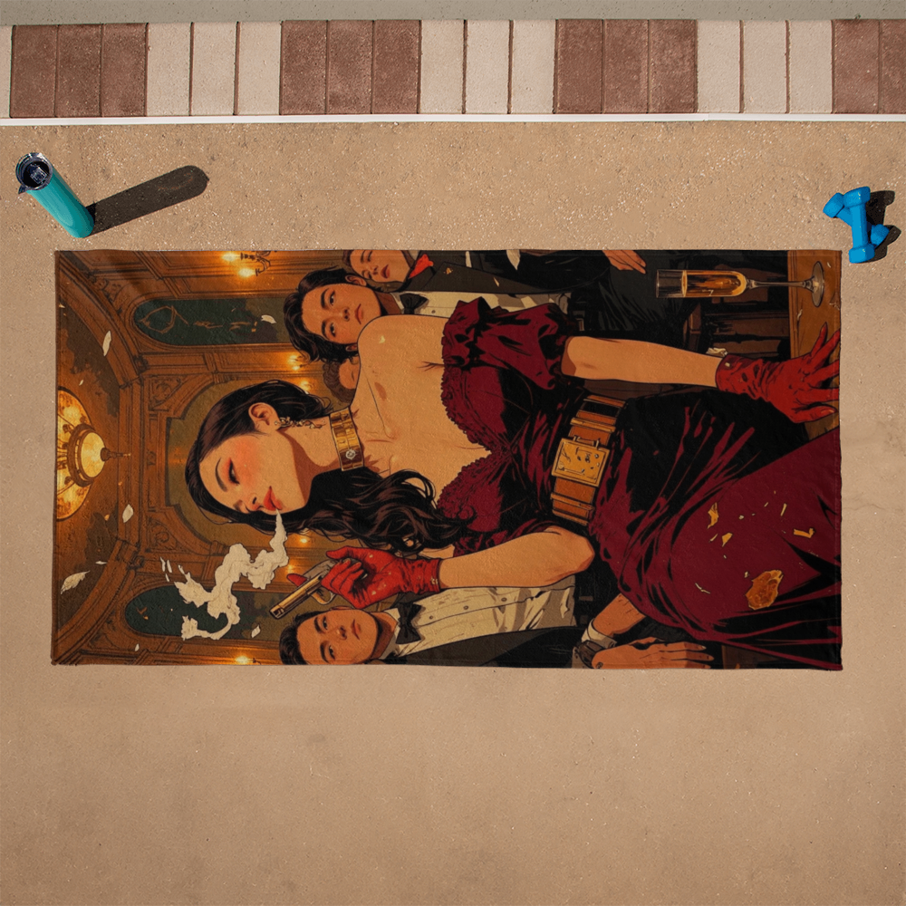 Step into a smoky ballroom of danger and decadence. This artwork captures a seductive assassin in crimson velvet, surrounded by tuxedos, secrets, and shattered egos. Cigarette in one hand, golden pistol in the other — elegance has a body count.