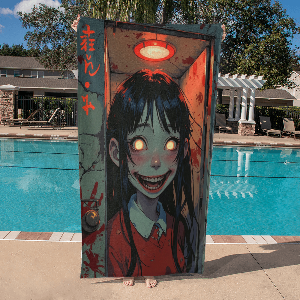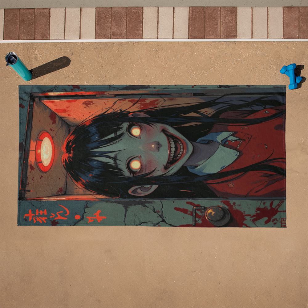 A disturbingly cheerful figure stares you down from a blood-smeared room, glowing eyes and teeth stretched in unnatural glee. This artwork fuses classic horror manga vibes with modern dread — perfect for fans of unnerving beauty and unsettling moods.