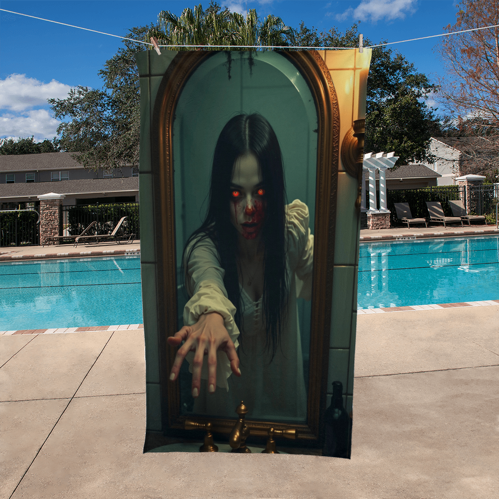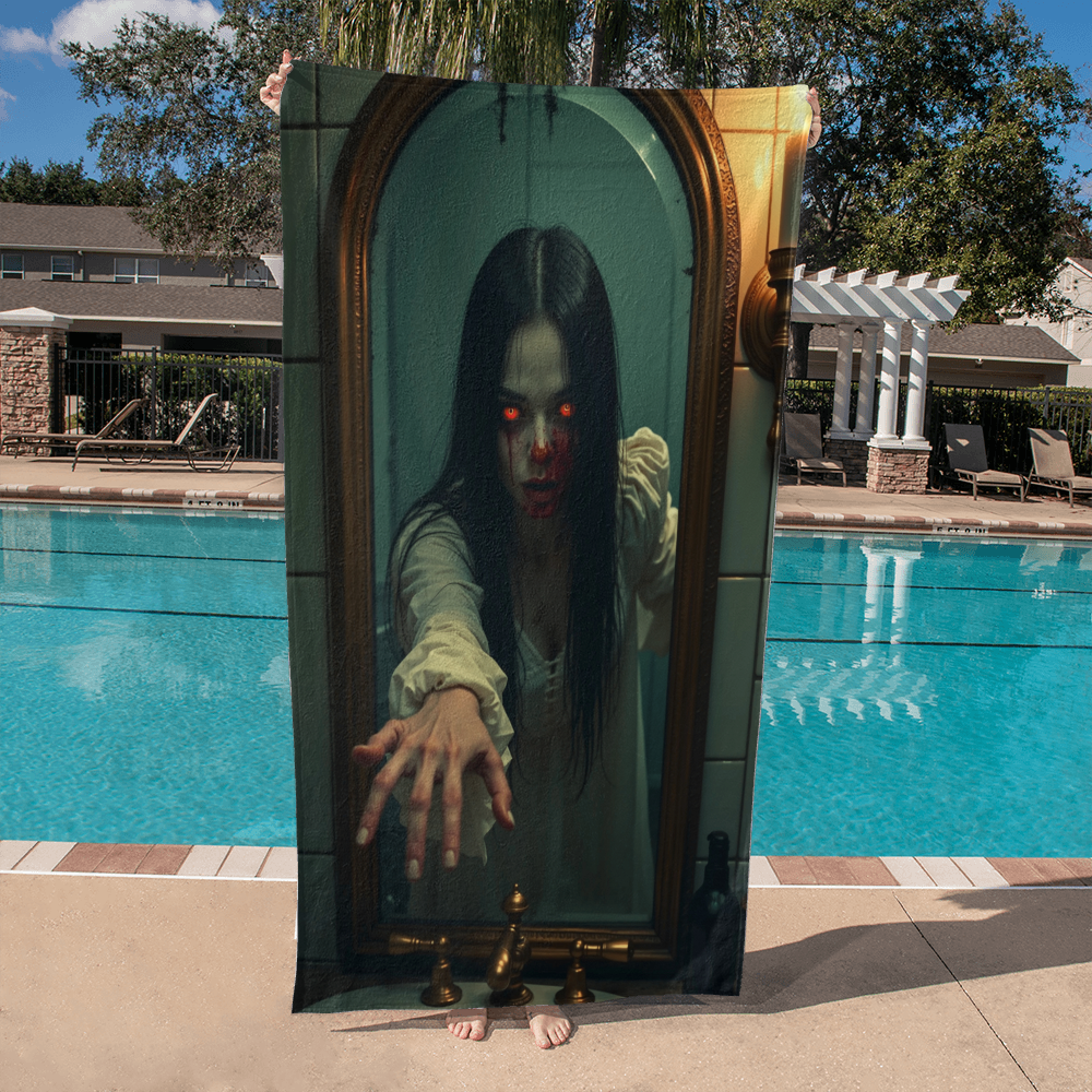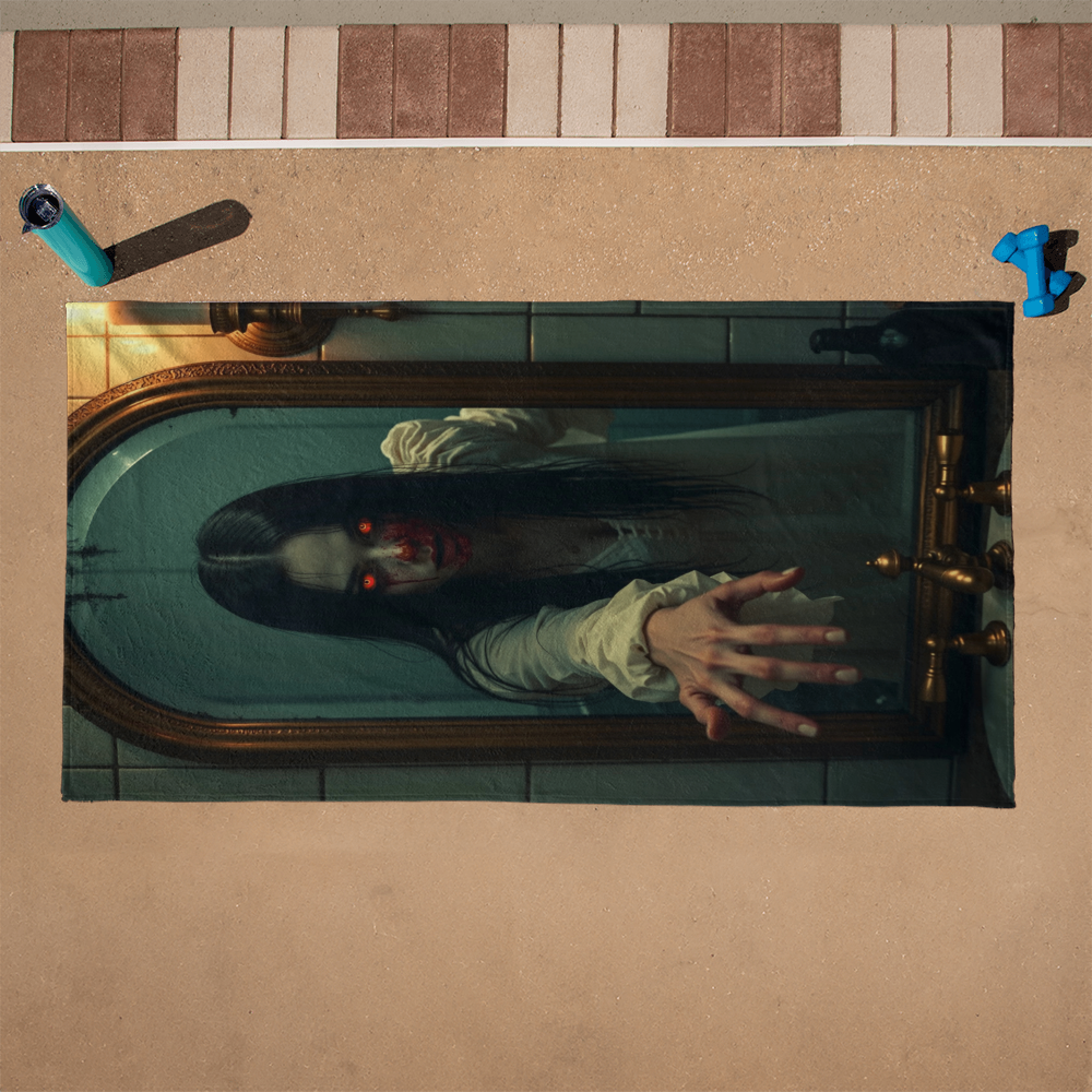 A blood-stained face with glowing red eyes, frozen in the moment she reaches through the mirror. You’re not just looking at her—she’s looking back. Hyper-detailed, deeply unsettling, and captured like a still from your worst nightmare.