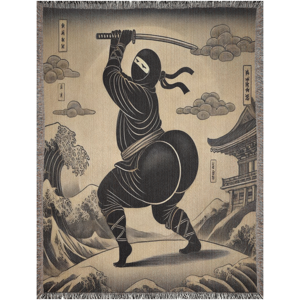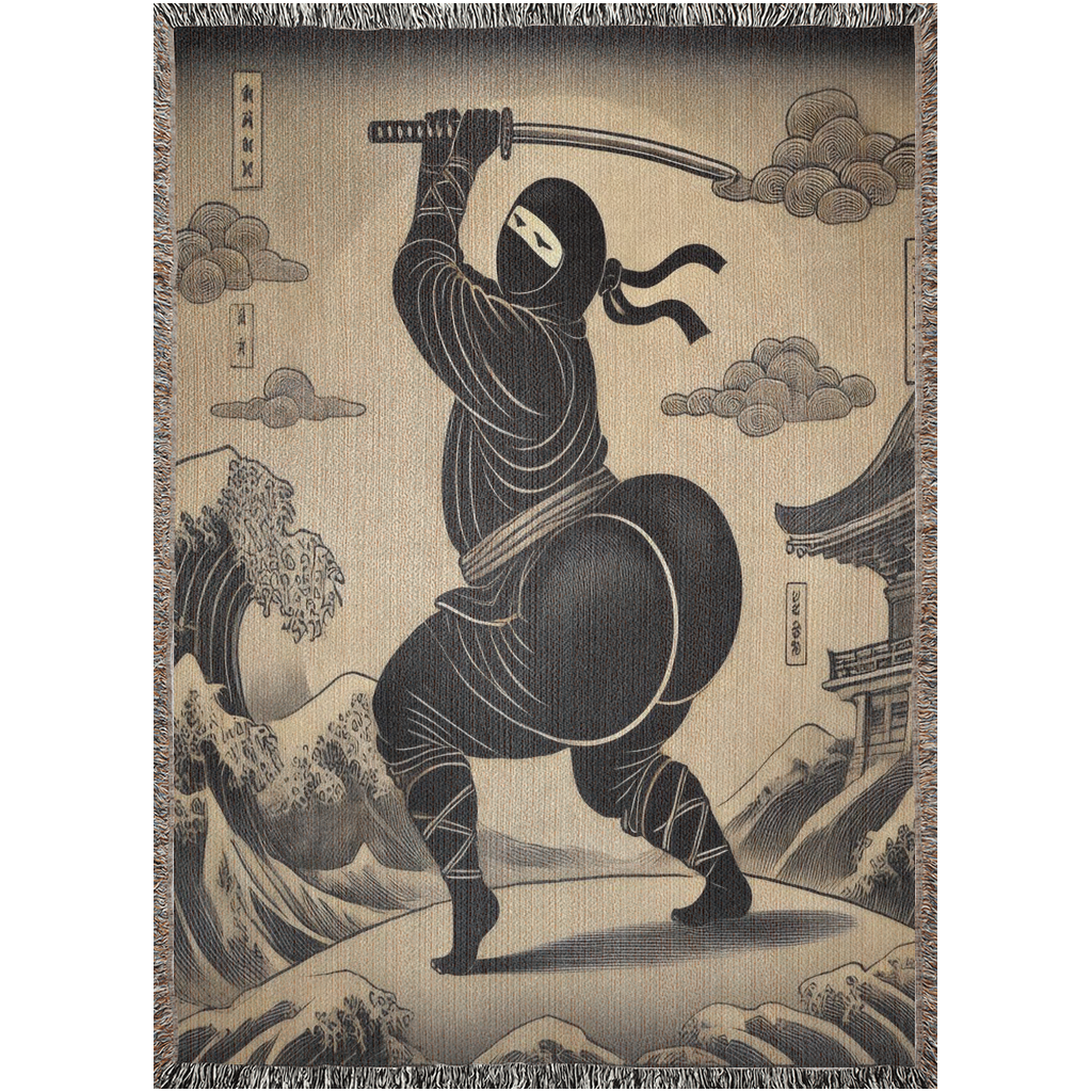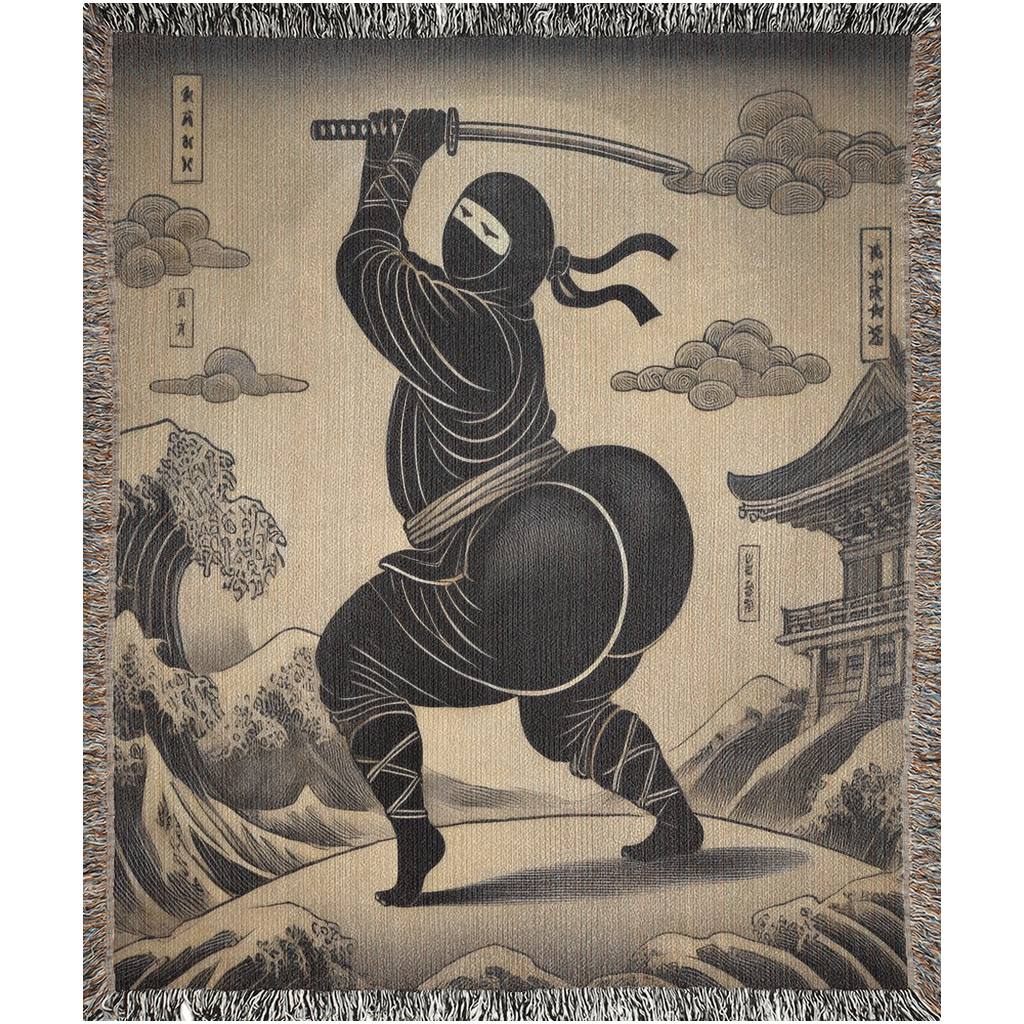 Step into a world where tradition meets boldness with this unique artwork! Featuring a vintage-style illustration of an obese ninja, this piece showcases the warrior in full traditional attire, poised with their katana held high above their head, ready to strike. Dynamic action lines burst around them, capturing the intensity of the moment. The scene is set against a classic backdrop of Japanese architecture and crashing waves, all rendered using a woodcut print technique that evokes a timeless, classic feel. The artwork is presented in a monochromatic black on beige paper, enhancing its retro aesthetic and bringing a touch of old-world charm to any space.