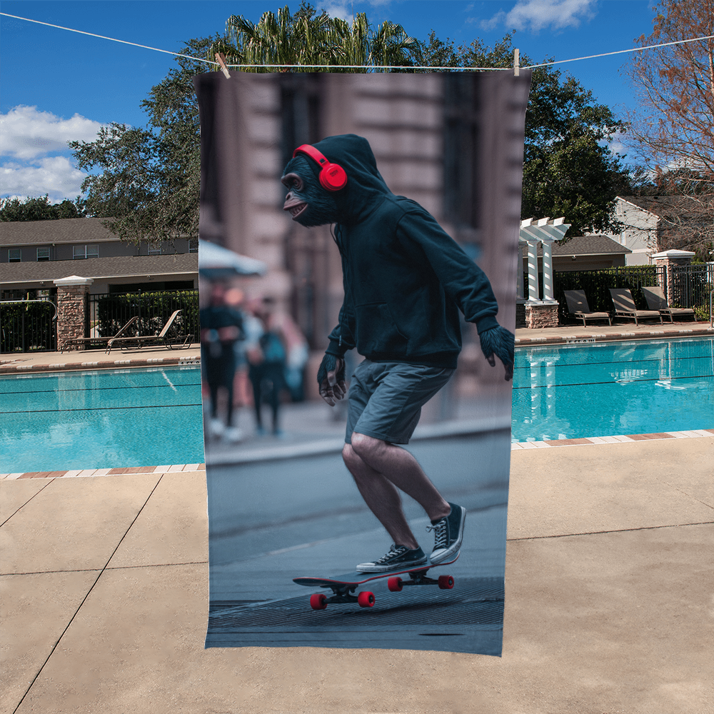 A street-savvy chimp in a hoodie, wired into the beat with red headphones, carving city pavement on a board like it’s instinct. This design doesn’t ask for attention—it hijacks it.