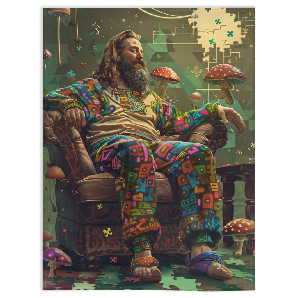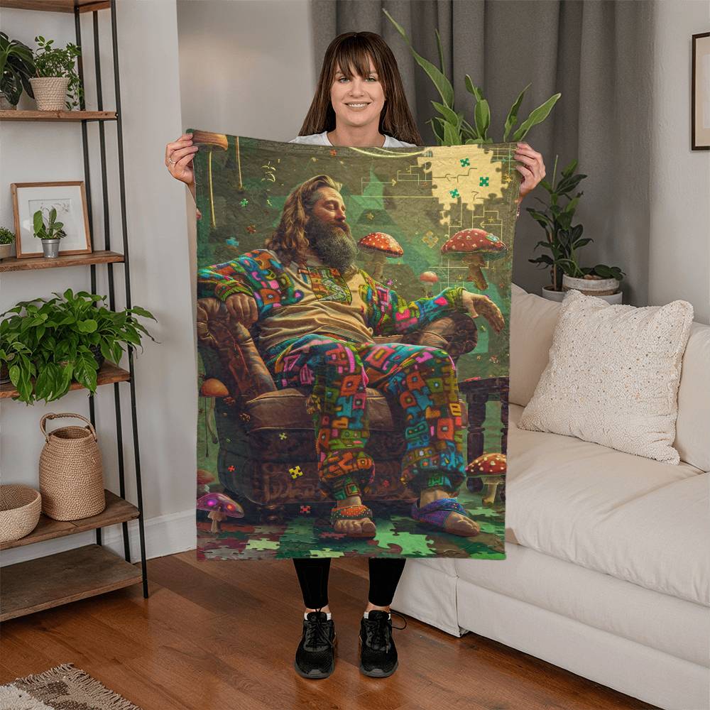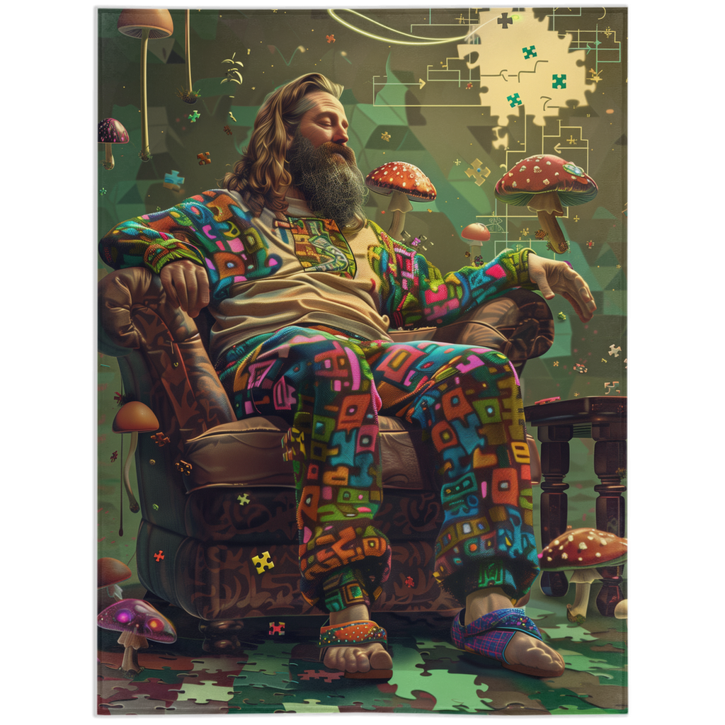 Step into a world of psychedelic wonder with our LS Dude. Picture this: a lone hippie, lost in the kaleidoscopic depths of an LSD trip, perched serenely on a chair amidst a swirl of colors, all captured in exquisite detail on our plush, velvety soft throw. It's not just a blanket; it's a journey into the depths of the human soul, a reminder of the beauty and chaos that lie within us all. But here's the catch: this masterpiece is a limited edition, a rare gem that only a lucky few will ever possess. Don't miss out on your chance to own a piece of pure, transcendent art.